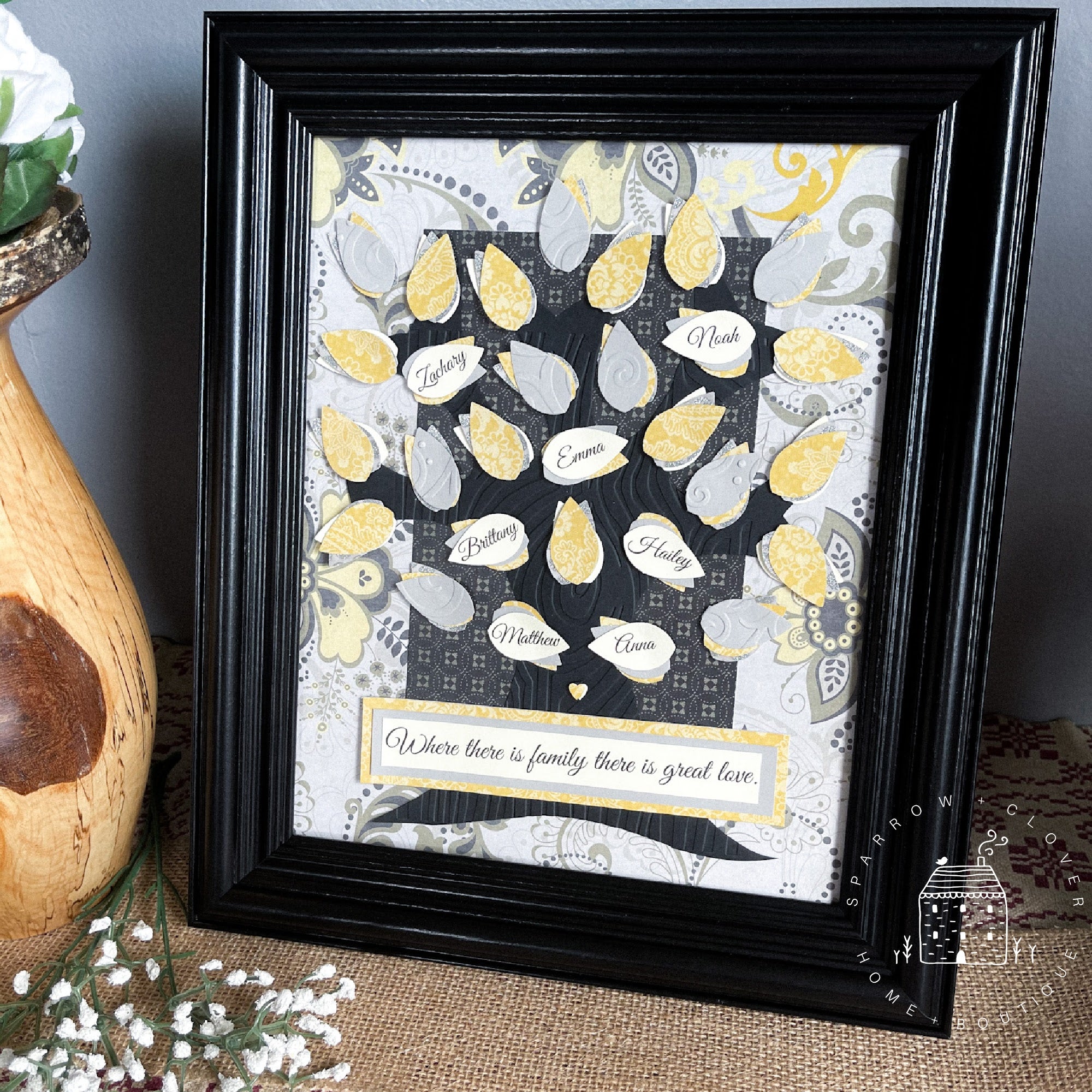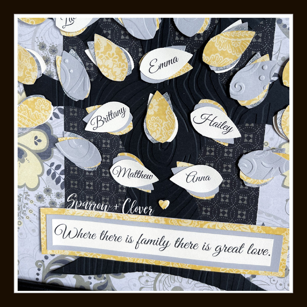The “Drop of Sunshine” color scheme includes shades of gray and yellow. Your tree will be crafted with acid-free cardstock in the exact colors and patterns pictured. (Color appearance may vary based on device settings.)