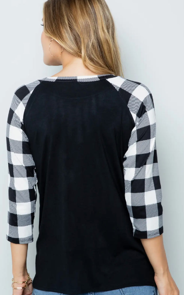 - Women's 3/4 sleeve raglan style top with sequin patch;