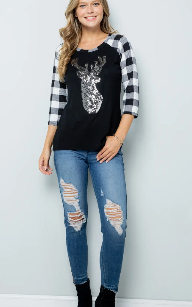 Our Raglan Shirt is a customer favorite, and we love this fun sequined reindeer for the holidays!