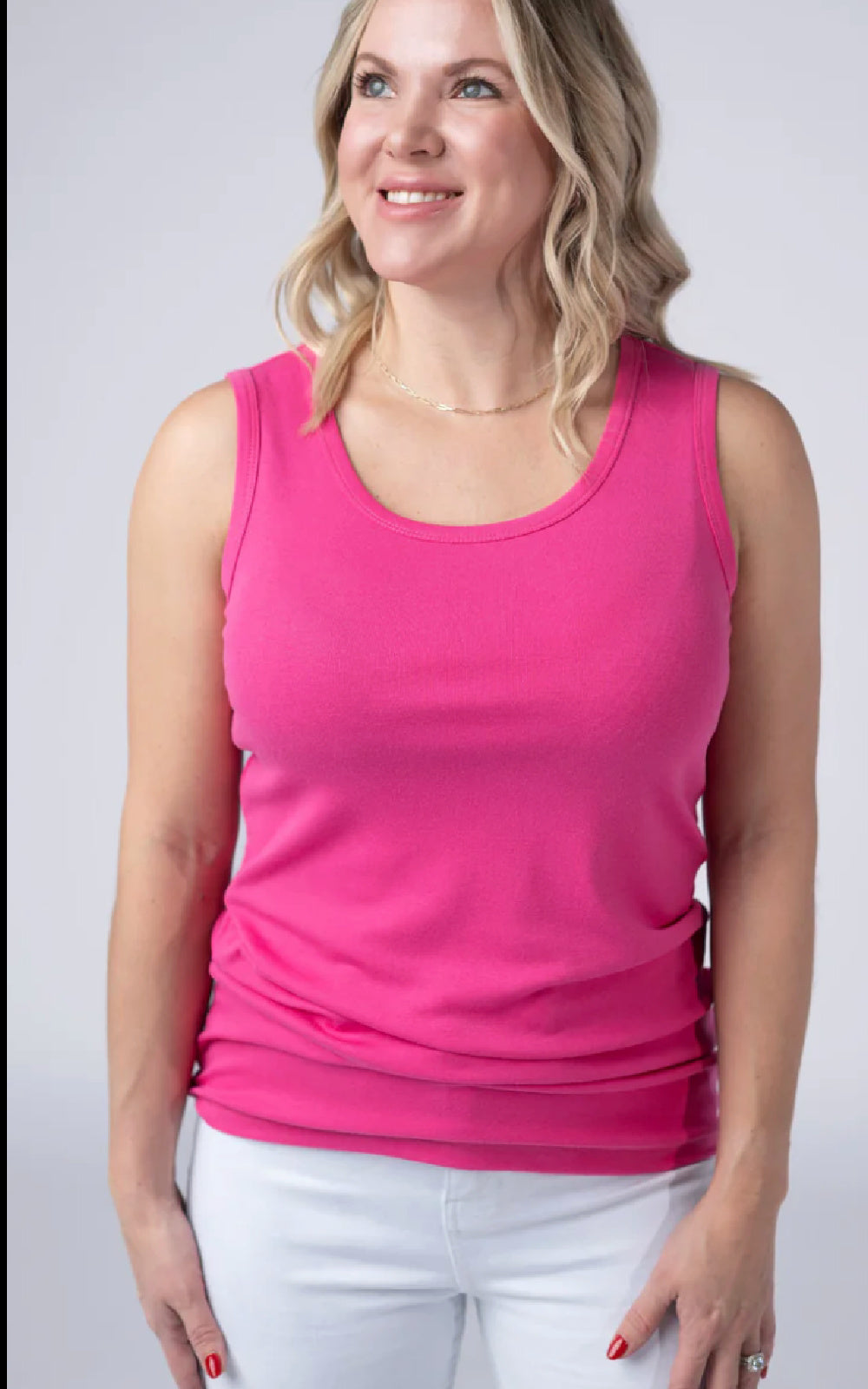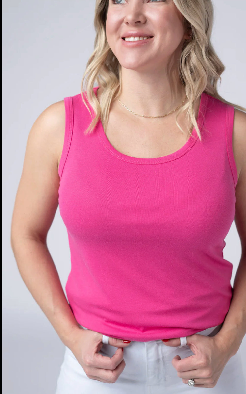 Get ready for spring with the Essential Tank in this fun hot pink color. This tank is the ultimate everyday essential, designed to bridge the gap between effortless comfort and chic versatility. It is the perfect layering piece for underneath your favorite jackets, cardigans and sweaters. And when the weather heats up, it looks great with denim shorts or a pencil skirt too.